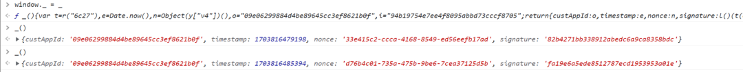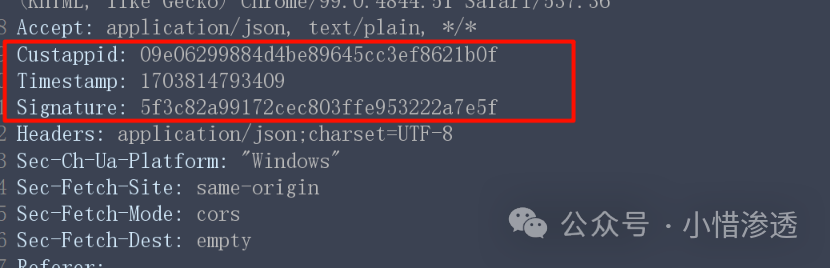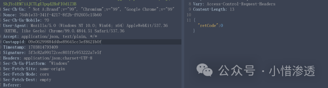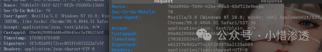 但是发现这个包有校验,这里请求头中多了四个参数,Custappid,Timestamp,Signature,Nonce,发现改动任何一个响应就会失败