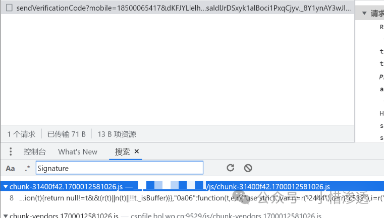 接下来去浏览器中,定位相关js代码逻辑,其实定位这里有很多方式,常用的两种方式就是全局搜索关键字或看流量堆栈,我习惯第二种,不过依据这次的环境全局搜索来的快一些