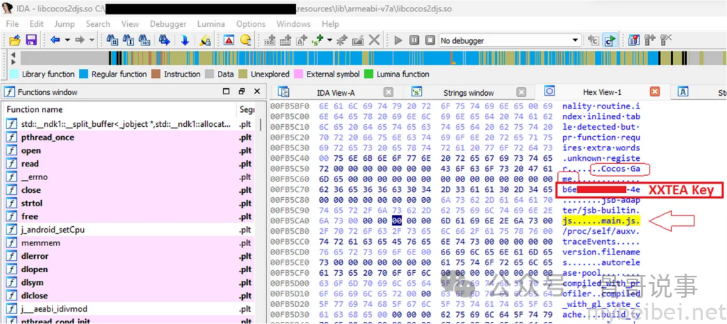 然后对`libcocos2d-x.so`文件进行逆向,搜索`main.js`函数,直接拿出IDA,尝试找到`Cocos2d-x`用来加密文件的解密密钥`XXTEA`: