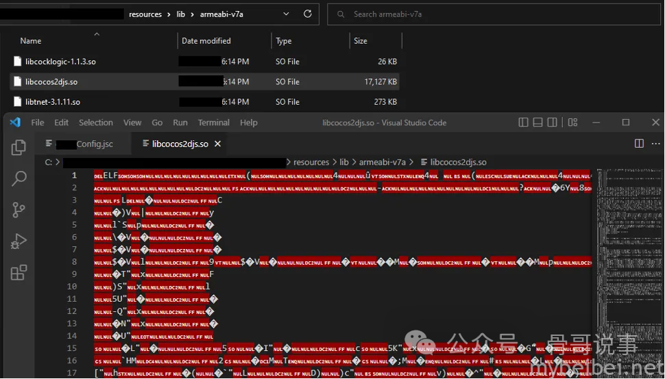 接着解密JSC文件,JSC是使用了Cocos2d-x(一种开源的跨平台开发框架)开发,因此在反编译的应用程序文件中搜索Cocos2d-x文件。