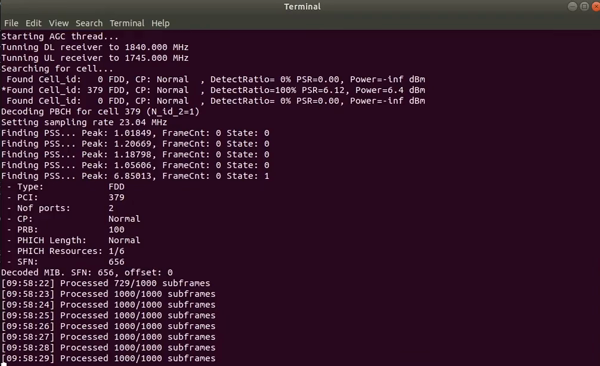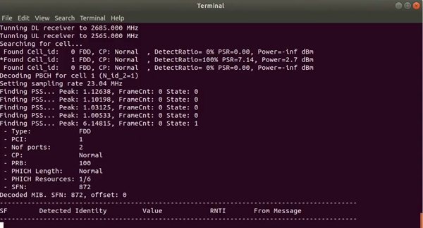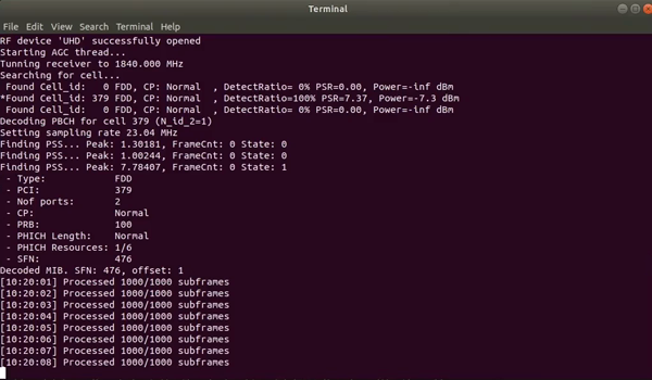 sudo ./<build-dir>/src/LTESniffer -A 2 -W <number of threads> -f <DL Freq> -C -m 0example: sudo ./src/LTESniffer -A 2 -W 4 -f 1840e6 -C -m 0-A: number of antennas-W: number of threads-f: downlink frequency-C: turn on cell search-m: sniffer mode, 0 for downlink sniffing and 1 for uplink sniffing(右滑查看更多)