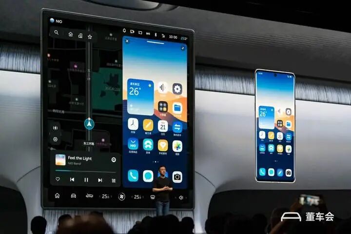 大家知道我们为什么要把中控屏做成竖屏形态的了吧?这也是早早就为手机准备好的。去年 9 月,蔚来在上海宝山举办了首届 NIO IN 蔚来创新科技日,台上的李斌手握一台星灰色的 NIO Phone,尝试用