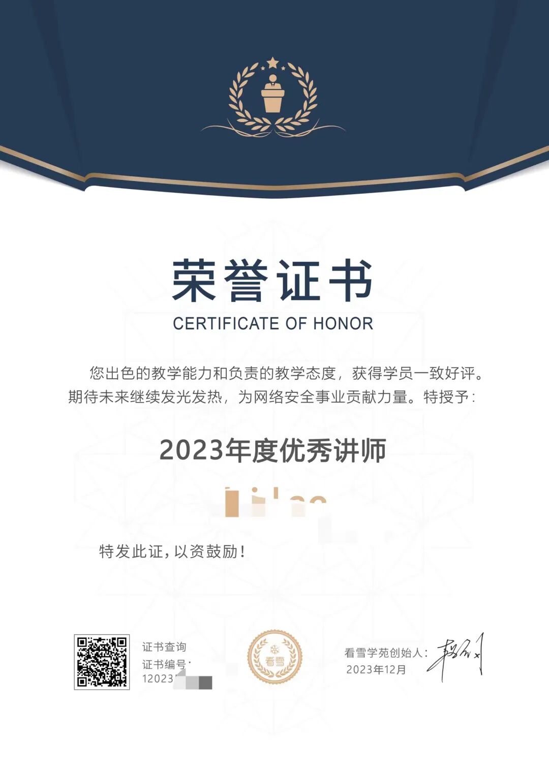 讲师聘书、年度优秀讲师证书等。