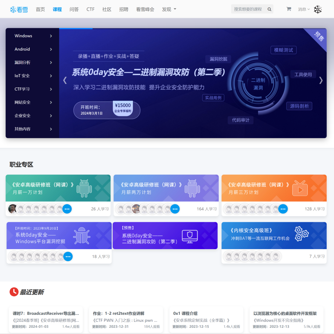 课程分为普通课、体系课、直播课,涉及入门、初级、中级、高级难度,涵盖Windows、Android、漏洞挖掘、安全编程、lOT安全、CTF、企业安全等多个细分领域,并设置“职业专区”课程,助力学员更好就业。