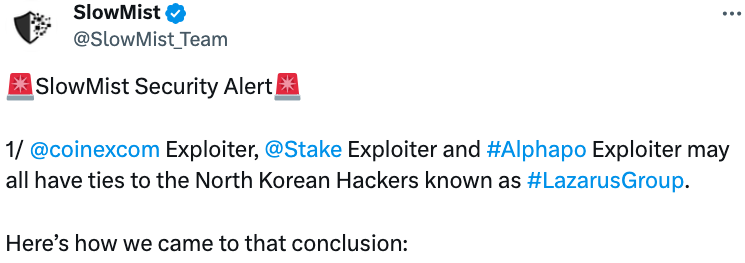 2023 年 9 月 12 日,加密货币交易所 CoinEx 遭遇黑客攻击,初步确定事件原因为热钱包私钥泄露,造成的损失预计已达 7000 万美元,影响波及多个区块链。CoinEx 推特称,已识别并隔离与黑客攻击相关的可疑钱包地址,存取款服务已暂停。9 月 13 日,慢雾安全团队在分析过程中发现 CoinEx 黑客与 Stake.com 黑客、Alphapo 黑客存在关联,CoinEx 黑客或为朝鲜黑客团伙 Lazarus Group。