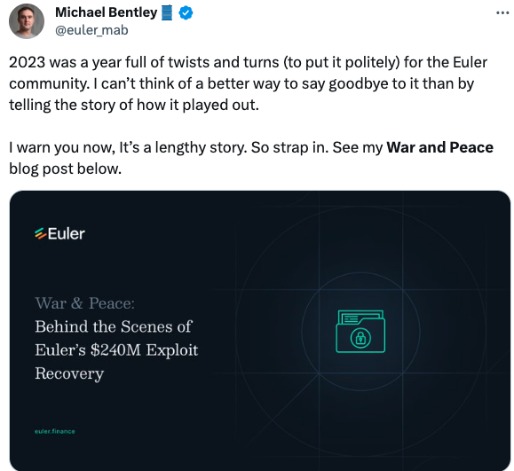 2024 年 1 月 10 日,Euler Labs 的 CEO Michael Bentley 发布名为《战争与和平》的博客,其中记述了这起攻击事件的背景、处理过程等细节。