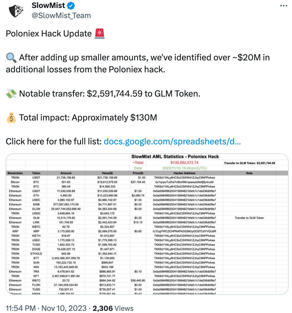 2023 年 11 月 10 日,Poloniex 交易所遭黑客攻击,造成的损失约为 1.3 亿美元。据慢雾安全团队分析,从攻击者这种迅速、专业的手法来看,猜测是典型的 APT 攻击,攻击者或为朝鲜黑客组织 Lazarus Group。孙宇晨表示:"Poloniex 团队已成功识别并冻结了与黑客地址相关的部分资产。目前,损失在可控范围内,Poloniex 的营业收入可以弥补这些损失,将全额偿还受影响的资金。”