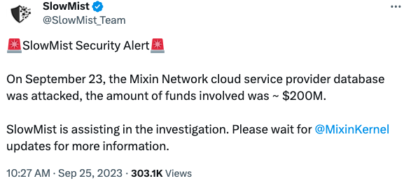 2023 年 9 月 23 日,Mixin Network 云服务提供商数据库遭到攻击,导致主网部分资产丢失,涉及资金约 2 亿美元,是 2023 年损失最大的攻击事件。随后,Mixin 官推称,已联系谷歌和慢雾安全团队协助调查。官方表示将最多赔付 50% 的损失,剩余部分以债券代币形式赔付,并用利润进行回购。