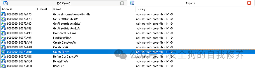 我们可以查看kernel32.dll的导入表来查找正在导入的CreateFileW版本。请注意,在本例中,该库不是 kernel32,而是 api-ms-win-core-file-l1–1–0,这是一个不同的库。有一种方法可以引用具有相同名称的函数,但这些函数由不同的 DLL 实现,这些 DLL 遵循此约定 DLLName!函数名称。例如,由 kernel32.dll 实现的 CreateFileW 版本称为 kernel32!CreateFileW,而 api-ms-win-core-file-l1–1–0 实现的版本是 api-ms-win-core-file-l1–1–0!CreateFileW。好的,因此,为了继续了解函数调用层次结构,我们必须了解 api-ms-win-core-file-l1–1–0 表示什么。