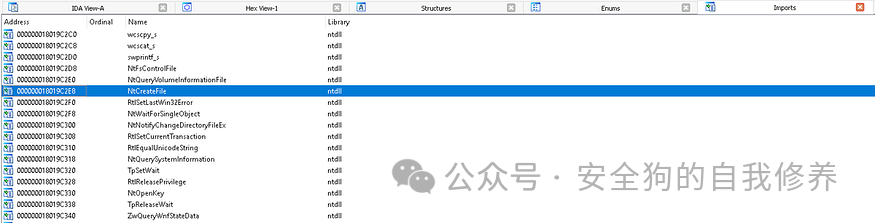 让我们检查一下导入表,看看什么 DLL 实现了这个函数。在下面的屏幕截图中,我们看到 NtCreateFile 驻留在 ntdll.dll 中,这意味着我们可以将此特定函数称为 ntdll!NtCreateFile。Ntdll 实现的函数属于称为本机函数的特殊函数类。一般来说,Microsoft 不鼓励直接使用本机函数,原因与它不鼓励使用未记录的函数类似。Win32 API 通常可以帮助开发人员完成在本机 API 层可能不那么容易实现的复杂任务。