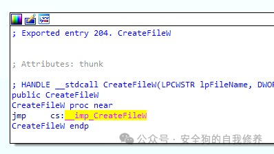 当我们到达 CreateFileW 的实现时,它立即显得相当平淡。这是我们前面提到的函数嵌套的开始。奇怪的是,CreateFileW 似乎在调用自己,但事实并非如此简单。请注意表示法,该部分表示当前 DLL (kernel32.dll) 中不存在此版本的 CreateFileW。相反,此版本的函数实际上是从外部 DLL“导入”的。正如我们讨论的 DLL 导出供其他应用程序使用的函数一样,二进制文件使用导出函数的方式是通过“导入”它,正如我们在这里看到的。__imp_CreateFileW__imp_