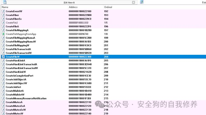 一旦我们确定了哪个DLL实现了该函数,我们就可以研究该函数在后台的工作方式。一种方法是将 DLL 加载到反汇编器(如 IDA 或 Ghidra)中。一旦kernel32.dll加载到IDA中并应用了公共符号,我们就可以单击导出选项卡,其中包含DLL导出的所有函数的列表。此列表包括函数的友好名称、函数实现的相对地址以及函数的序号。我们可以搜索 CreateFileW,找到它后,我们可以在列表中双击它,这将带我们进入函数的实现。
