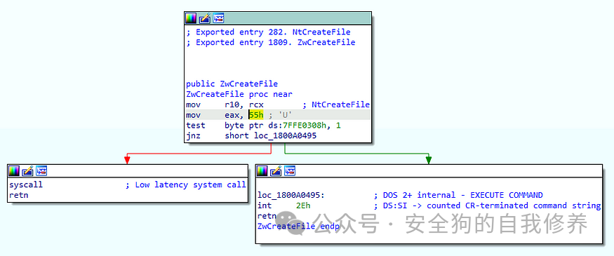 我们可以将 ntdll.dll 加载到反汇编程序中,加载符号,然后导航到 NtCreateFile 的实现。原生 API 通常在执行层次结构中扮演着简单但非常重要的角色。他们的职责是进行适当的系统调用(系统调用)。系统调用是一种特殊类型的函数调用,负责通过 64 位系统上的指令将执行从用户模式转移到内核模式。请注意,右下角的基本块执行“系统调用”操作。此外,突出显示的值 , 表示内核中 NtCreateFile 对应项的值,我们可以将其称为 ZwCreateFile。一个复杂的因素是,与特定系统调用关联的数字可能会因操作系统版本而异,因此为了在此级别运行,开发人员必须非常清楚他们正在操作的操作系统版本。最近,直接进行系统调用已成为一种相对常见的可见性绕过,特别是因为它是绕过任何用户模式信号生成的好方法。要了解它是如何被利用的,请查看 j00ru 的 windows-syscalls 项目。SYSCALL55h