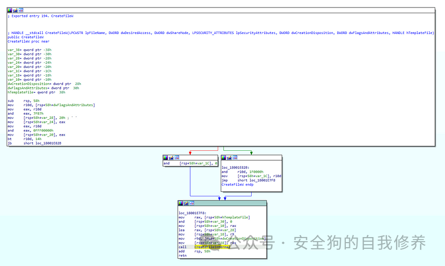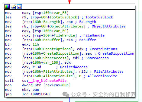 我们可以双击 CreateFileInternal,kernelbase 调用的内部函数!CreateFileW,以查看其内容,其中显示对名为 NtCreateFile 的导入函数的调用。