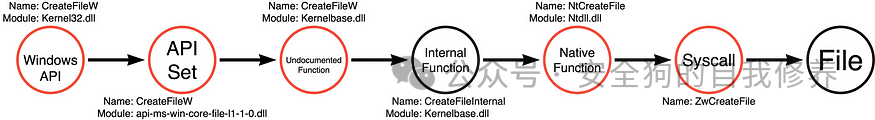 为了更好地理解函数调用或函数调用嵌套之间的关系,我们应该研究一个常见的 Win32 API 函数的案例研究,特别是 CreateFileW。