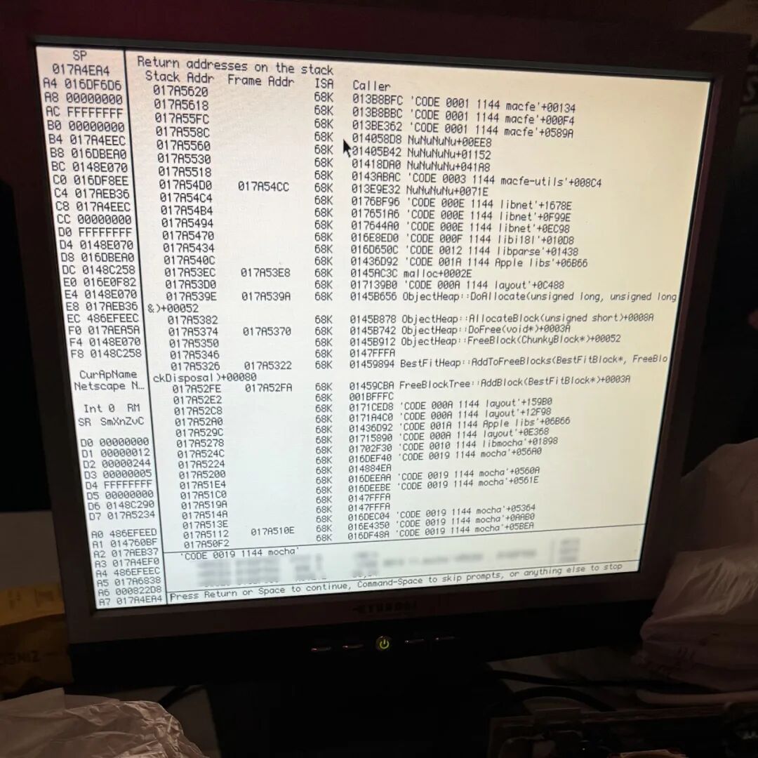这台真机上安装了 MacsBug,崩掉之后直接进入调试器界面。