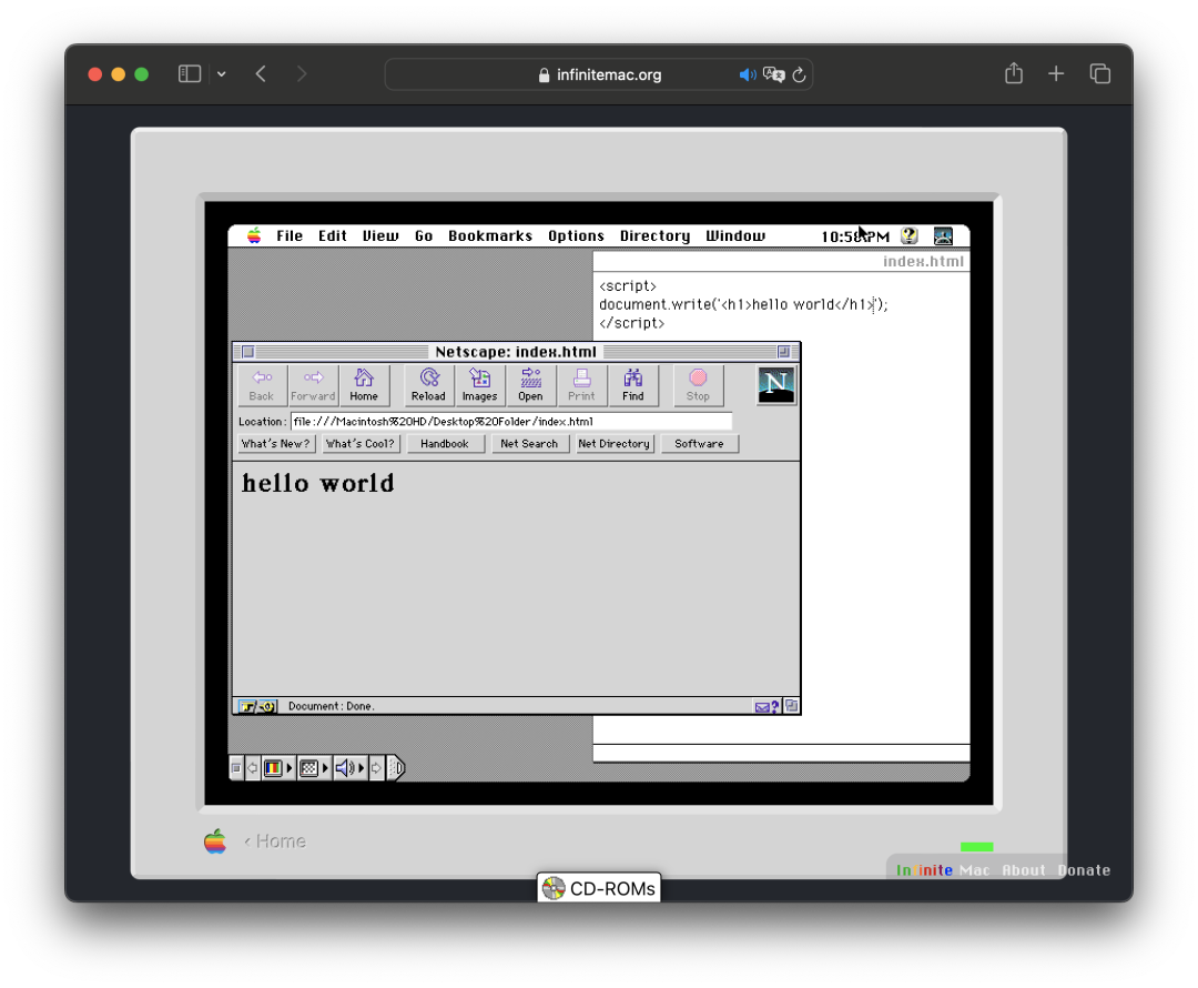 这个网页版的虚拟机似乎没有模拟网络栈,所以无法访问任何在线的网站。但是可以用 SimpleText 编辑器,编辑保存好 html 文件后,拖到浏览器查看。