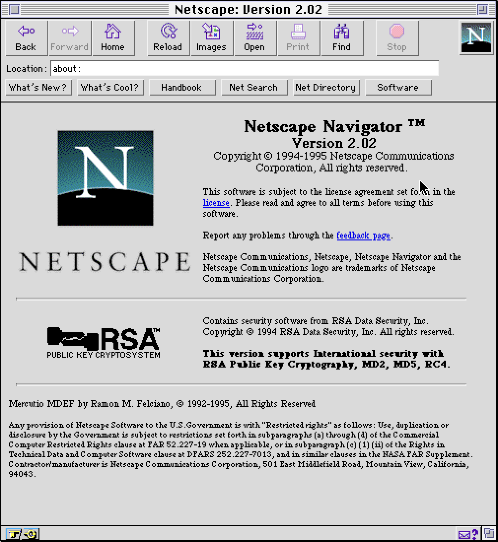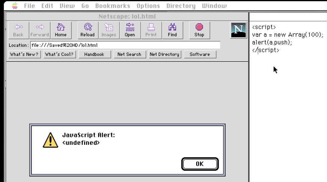 这台 Macintosh 安装了 1996 年发布的 Netscape Navigator 2.0.2,距离史上第一个搭载 Javascript 的 2.0 beta 仅仅过去几个月,可谓是始祖级的 js 引擎。