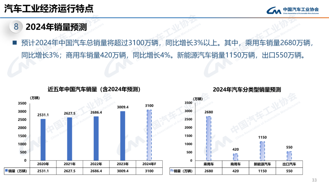 预计2024年中国汽车总销量将超过3100万辆,同比增长3%以上。其中,乘用车销量2680万辆,同比增长3%;商用车销量420万辆,同比增长4%。新能源汽车销量1150万辆,出口550万辆。
