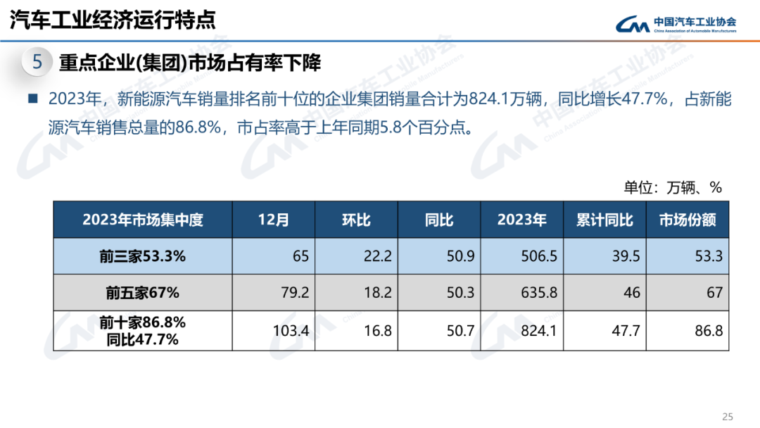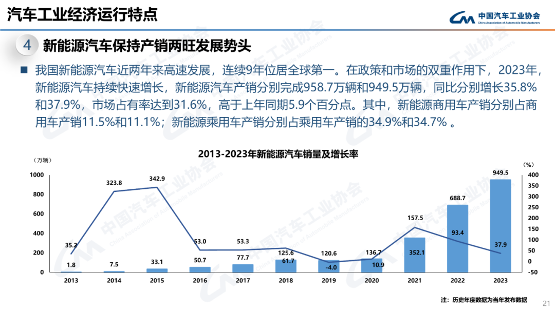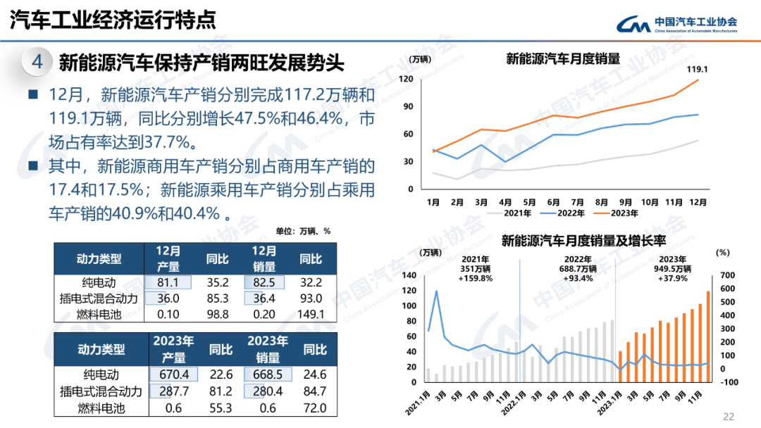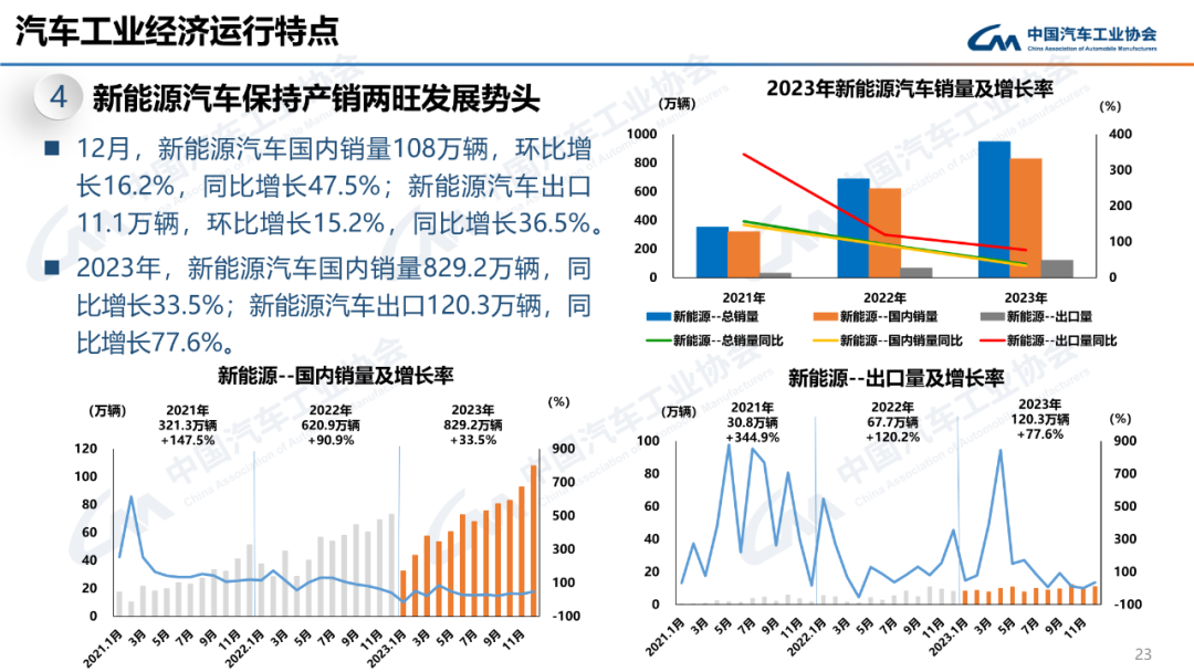 12月,新能源汽车产销分别完成117.2万辆和119.1万辆,同比分别增长47.5%和46.4%,市场占有率达到37.7%。2023年,新能源汽车产销分别完成958.7万辆和949.5万辆,同比分别增长35.8%和37.9%,市场占有率达到31.6%,高于上年同期5.9个百分点。