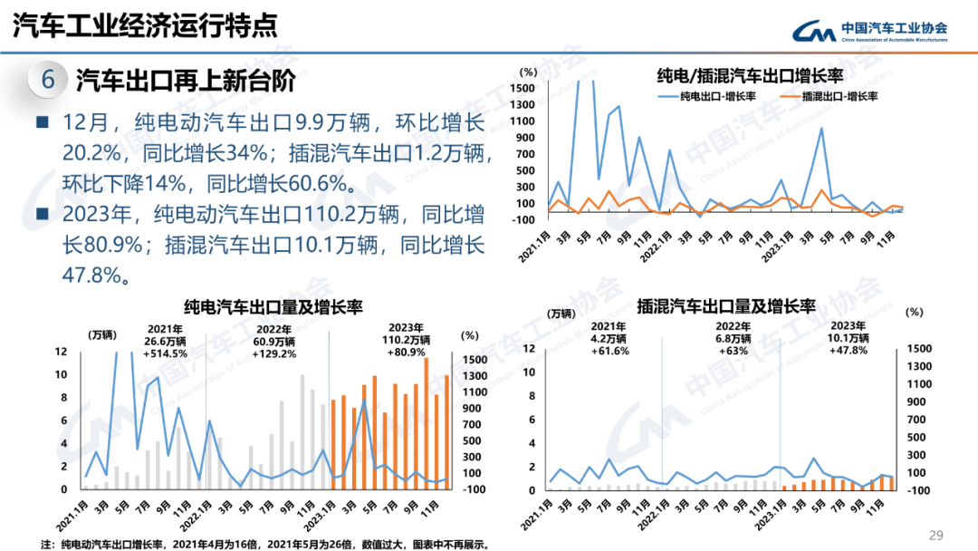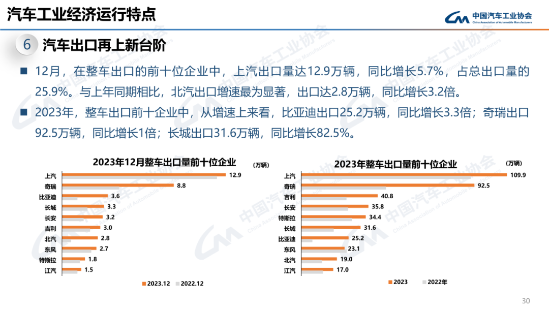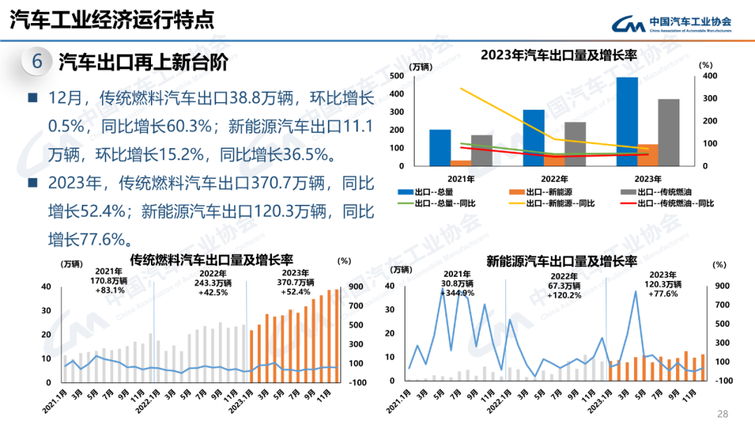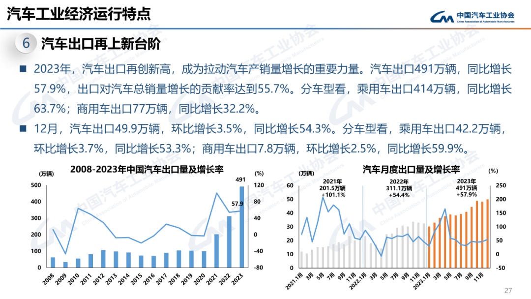 12月,汽车出口49.9万辆,环比增长3.5%,同比增长54.3%。2023年,汽车出口491万辆,同比增长57.9%。