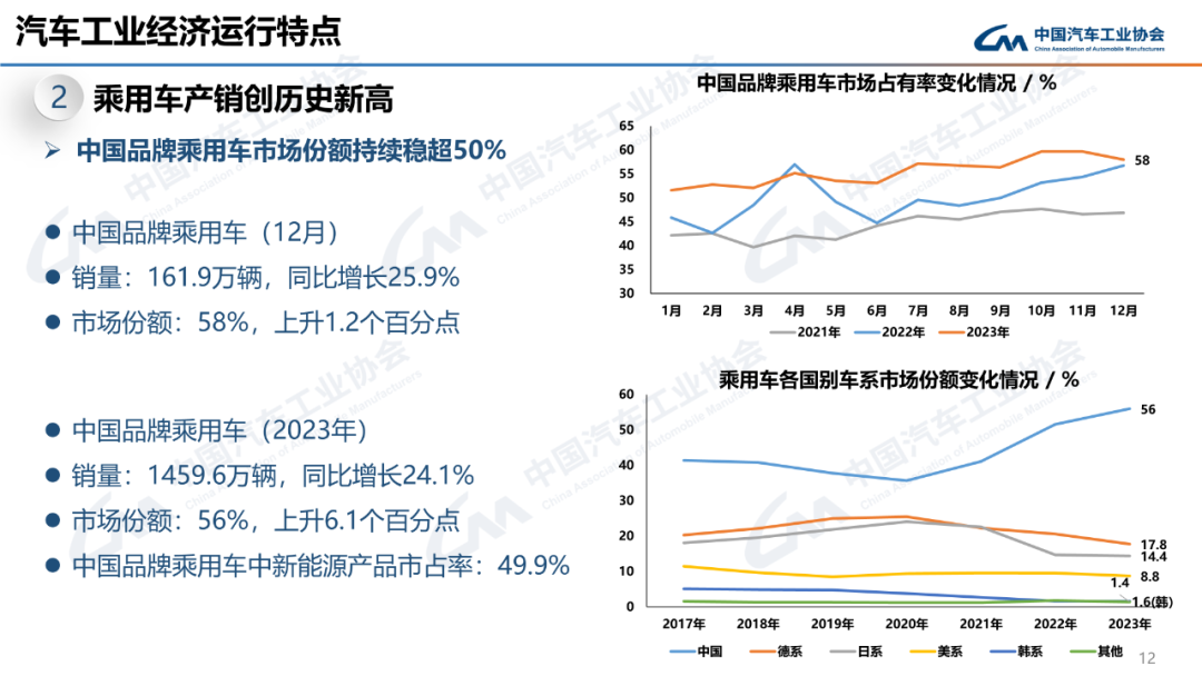 12月,中国品牌乘用车销量为161.9万辆,同比增长25.9%,市场份额为58%。2023年,中国品牌乘用车销量为1459.6万辆,同比增长24.1%,市场份额为56%。