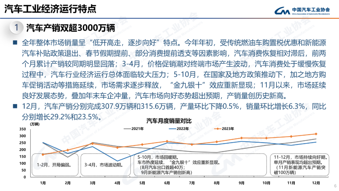 中国汽车工业协会副秘书长陈士华:2023年,汽车产销总体呈现前低后高的发展态势,在年底达到高点,12月销量达到315万辆,创历史新高。全年产销双双突破3000万辆,这是一个新的历史记录,从全球看,还没有哪一个市场能达到这个规模。