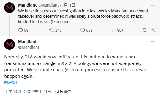 因未启用2FA被暴力破解,黑客接管谷歌子公司Mandiant的X账户