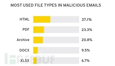 另一方面,调查显示威胁行为者精明且适应性极强。2022年,在Microsoft默认禁用宏之后,DOCX文件(下降了9.5个百分点)和XLSX文件(下降了6.7个百分点)的使用量显著下降。相反地,网络罪犯选择了HTML文件(占分析文件的37.1%)、PDF文件(23.3%)和Archive文件(20.8%)。其中,HTML文件的使用尤为显著:与2022年相比,2023年的使用率上升了76.6%。