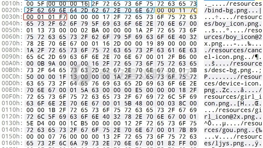 首先为4字节,为包内文件的数量,如“00 00 00 5F”代表一共有95个文件,然后是包内文件各自的信息,例:“00 00 00 16”代表文件名称的长度为22个字节,“2F 72 65 6F...... 2E 70 6E 67”为带存放路径的文件名称,“00 00 11 7C”对应文件在小程序包中的具体偏移位置,“00 01 01 F7“对应文件在小程序包中的数据长度。