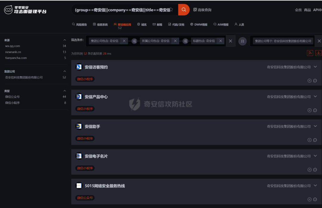 笔者常用的搜索方式为使用微信官方小程序界面的搜索功能与北京零零信安科技有限公司的 0.zone平台,后者可以全自动采集目标企业APP(APK)列表、下载地址和其详情介绍等信息,半自动进行小程序、公众号、生活号等的列表、名称和地址采集。较官方搜索功能,可以更精确的检索目标。