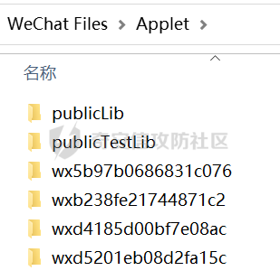 在WeChat Files目录下有一个名为Applet的文件夹,以“wx”开头的文件夹即为小程序文件夹。如果之前打开了很多微信小程序,那么目录中就会存在多个小程序文件夹。第一种区分方法是按照修改时间来进行区分。第二种方法是在微信页面中删除所有浏览过的小程序,重新打开需要进行测试的小程序,那么目录中只会存在一个小程序文件夹。