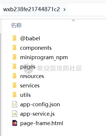 但这并不是最初的原项目文件结构,原因是微信服务器会将小程序源码中所有的“js”文件压入“app-service.js”文件中,将所有的“json”文件压入“app-config.json”中,将所有的“wxml”文件压入“page-frame.html”文件中,“wxss”则在处理之后以“html”文件的形式存留在对应页面目录之下。