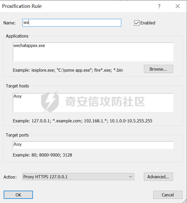 添加规则:程序“wechatappex.exe”,动作为刚才设置的代理服务器