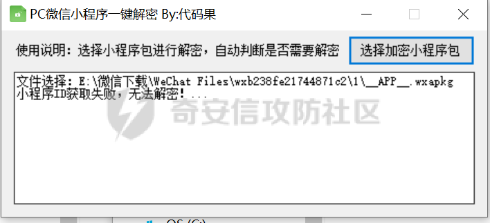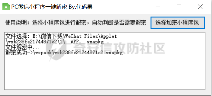 这里使用的解密工具为代码果所编写UnpackMiniApp.exe,用法为点击“选择加密小程序包”,选中待解密的__APP__.wxapkg,将会在UnpackMiniApp.exe当前目录的wxpack文件夹中生成解密后的文件。