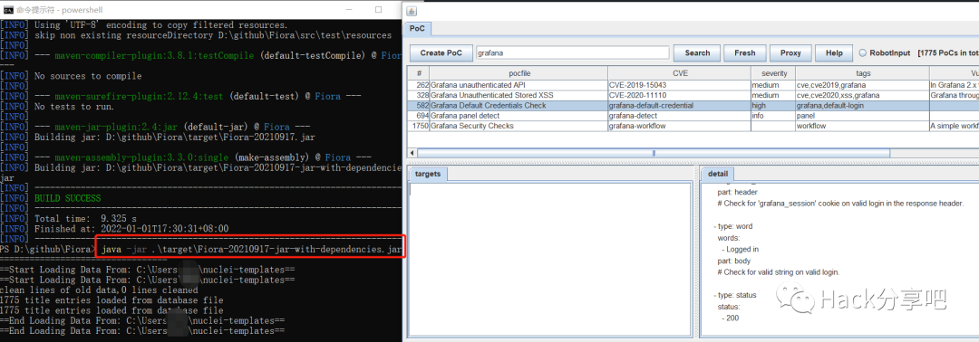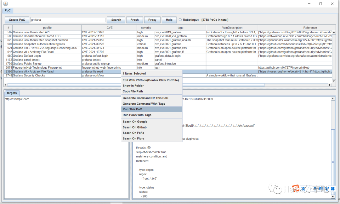 #生产的单个PoCnuclei -t C:\Users\P52\nuclei-templates\vulnerabilities\grafana\grafana-file-read.yaml -u http://example.com -proxy http://127.0.0.1#生产workflow PoCnuclei -w C:\Users\P52\nuclei-templates\workflows\grafana-workflow.yaml -u http://example.com -proxy http://127.0.0.1nuclei -tags grafana -u http://example.com -proxy http://127.0.0.1
