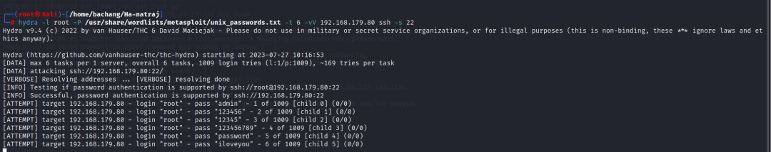 因为支持密码登录,尝试root账户的密码爆破,利用工具hydra,线程-t为6