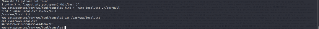www-data @ubuntu:/var/www/html/console$ find / -name local.txt 2→/dev/null