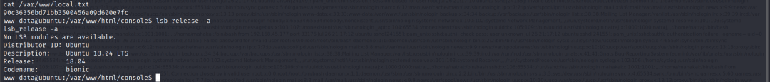www-data @ubuntu:/var/www/html/console$ cat /var/www/local.txt