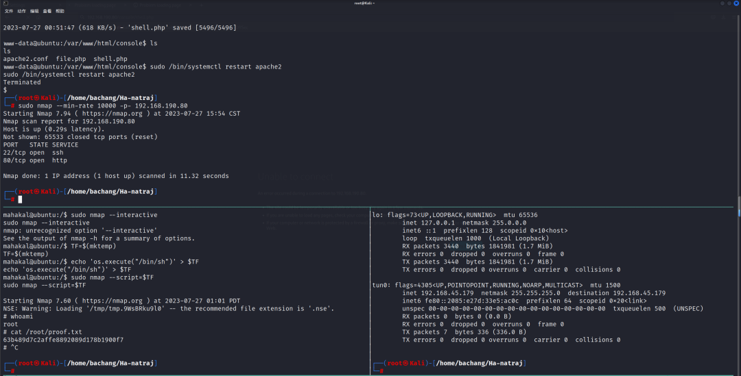 提 权 思 路 → 发现sudo级别的apache2服务 → apache2服务启动时修改其用户权限 → 重启apache2从目录权限提升到用户权限 → sudo-nmap权限提升