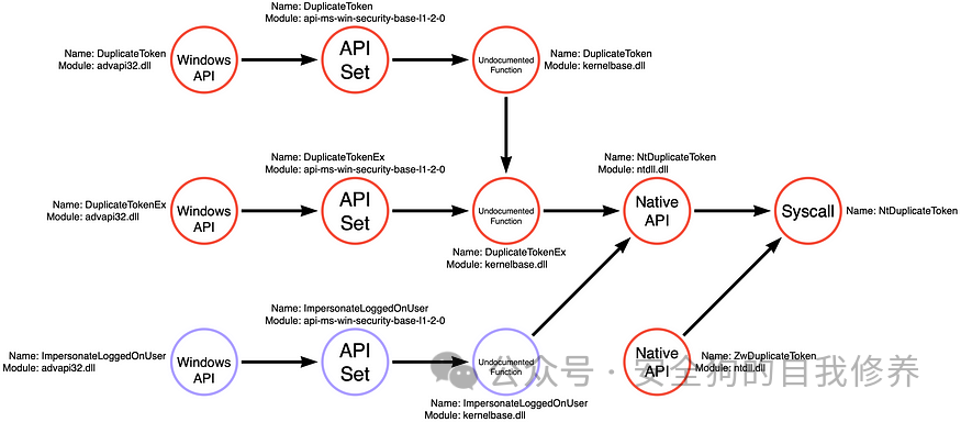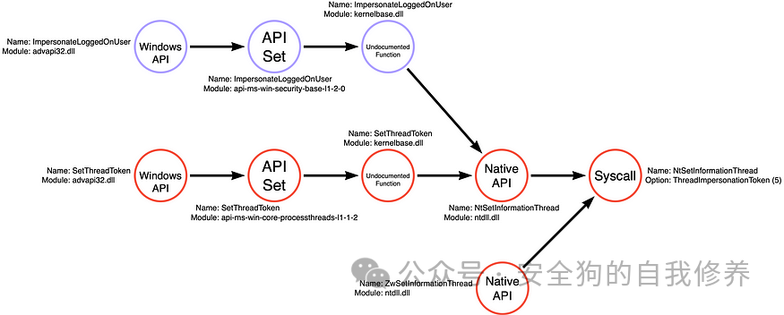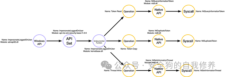 上面我们看到了 的复合函数图。尽管如此,我们还是可以看到这个复合函数如何集成到令牌复制和线程写入操作的函数调用图中。我希望你注意的一个关键细节是,这次有三个紫色节点,而不是我们看到的那个。 具有与我们见过的许多简单函数相似的分层结构。它有一个记录的函数、一个 API 集和一个未记录的函数组件。关键是应用程序可以调用这三个函数中的任何一个,但这三个函数都会导致复合结果。因此,我已将所有三个节点都包含在函数调用图中。然而,所有三个节点都呈紫色,以表明它们的复合性质。ImpersonateLoggedOnUserToolhelp32ReadProcessMemoryImpersonateLoggedOnUser