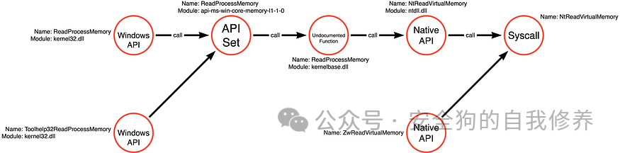 本系列的第一篇文章分析了 Mimikatz 源代码,发现它依赖于对 的调用。然后,可以使用“了解函数调用堆栈”一文中讨论的方法生成 的函数调用路径。如果应用程序调用 ,它随后将调用 ,然后 ,然后 ,最后通过关联的系统调用将执行转换为内核。我认为这个函数调用路径代表了正常的功能行为。它非常简单,执行从路径中的每个函数传递,没有任何弯路,如下图所示。kernel32!ReadProcessMemorykernel32!ReadProcessMemorykernel32!ReadProcessMemoryapi-ms-win-core-memory-l1–1–0!ReadProcessMemorykernelbase!ReadProcessMemoryntdll!NtReadVirtualMemoryNtReadVirtualMemory