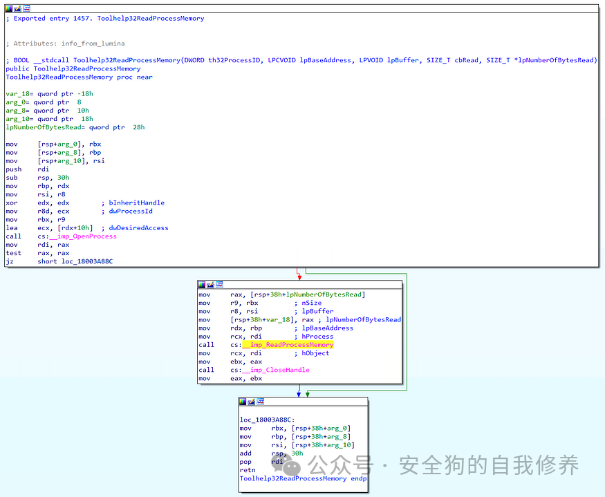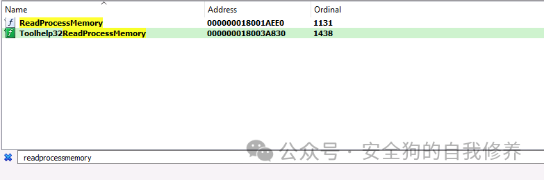 正如了解函数调用堆栈一文中提到的,分析过程中的第一步是打开实现 DLL 并在导出表中搜索对相关函数的引用。这种搜索最终导致了函数的代码实现,这有助于我们理解函数的工作原理。在搜索 时,我偶然发现了第二个名称相似的函数,称为 ,这激起了我的兴趣。ReadProcessMemorykernel32.dllToolhelp32ReadProcessMemory