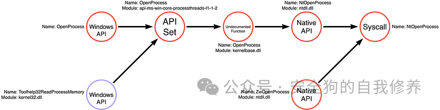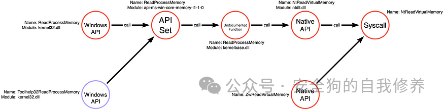 Toolhelp32ReadProcessMemory是执行多 (3) 个操作的单个函数。 用于“进程访问”操作、“进程读取”操作和“处理关闭”操作。While 遵循简单的函数调用路径,但情况并非总是如此。某些函数(如 )实际上充当微型独立应用程序。我已经开始将这些多操作函数(如 )称为“复合函数”,同时将单操作函数(如 )称为“简单函数”。OpenProcessReadProcessMemoryCloseHandlekernel32!ReadProcessMemoryToolhelp32ReadProcessMemoryToolhelp32ReadProcessMemoryReadProcessMemory
