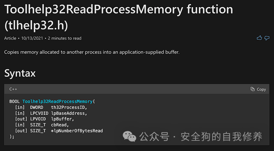 根据该函数的文档,它的行为类似于 ,但有一个例外。 需要从中读取的进程的句柄,而只需要进程标识符 ()。它似乎在功能上等同于 ReadProcessMemory,但可能更易于使用,或者至少可能允许绕过 所需的讨厌的进程访问操作。跳过进程访问操作对攻击者很有用,因为此技术的绝大多数检测规则都专门针对此操作。Toolhelp32ReadProcessMemoryReadProcessMemoryReadProcessMemoryToolhelp32ReadProcessMemoryth32ProcessIDToolhelp32ReadProcessMemoryReadProcessMemory
