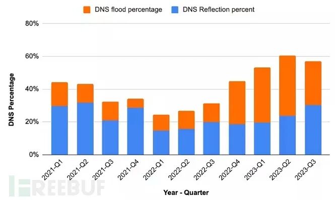 【图2:2023年近60%的DDoS攻击有DNS组件,比2022年第一季度增长了近200%】