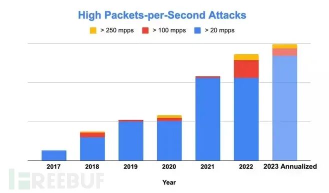【图1:2021年至2023年,高pps的L3和L4层DDoS攻击总数增长了近50%】