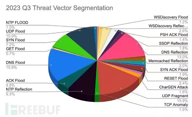 下图展示了2023年第三季度网络犯罪分子用于DDoS攻击的不同媒介。