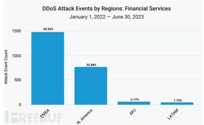 事实上,亲俄黑客组织(包括Killnet、REvil和Anonymous Sudan等)在2023年6月初宣布,他们将对欧洲和美国的金融机构进行大规模的协同DDoS攻击。也许这种亲俄黑客行动主义更好地解释了金融服务垂直领域DDoS攻击的地区变化,因为EMEA现在的事件数量几乎是北美的两倍(见图4)。